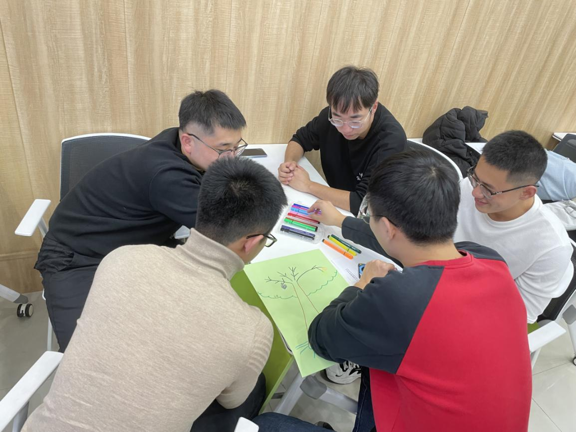 朋辈心理辅导员王春露主持,由我院研究生班长高宁负责收集协助组织,共有32名研究生参与此次活动。本次活动分为两个阶段。第一阶段是热身阶段,首先让大家鼓掌欢迎自己进入人生新的阶段,之后,让参与的同学们进行简短的自我介绍,增加彼此之间的熟悉感,放下戒备,让同学们进入放松的状态。第二阶段为游戏比拼阶段,将同学们分组,每个小组抽取单词卡片,经过组内商讨分工后,用身体摆出抽到的单词,增强小组内成员间的沟通合作。之后,带领大家进行“解密千千结”、“绘制团体树”的环节,并进行游戏体验和团体树概念创作理念的分享。最后,让同学分享参与此次活动的感受与收获。