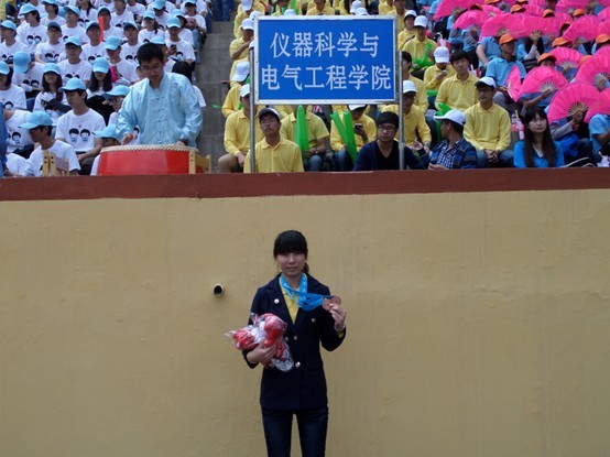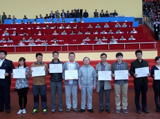 各个学院的方阵代表队。我院运动员方阵个个英姿飒爽,迈着矫健的步伐,扬起自信的脸庞,踏着鲜明欢快的节奏,精神饱满地行走在运动场上。在青年三路长拳表演中,他们气势如虹、英姿飒爽、斗志昂扬,迎来了观众们的阵阵掌声。整齐划一的动作,气势恢宏的拳法,沉稳扎实的马步,传递着志在四方的理想,彰显着仪电男儿的雄风。在运动会正赛上,我院在多个项目中取得了优异的成绩,其中2013级张晓寒同学在学生女子立定三级跳远和女子110米栏项目中荣获两枚铜牌。在运动会闭幕式上,学校对2013年度“阳光体育”优秀学院及个人举行了颁奖仪式,校党委书记陈德文教授为获奖学院及个人颁奖,我院团委书记朱宇代表学院接受颁奖并与陈德文书记合影留念。
