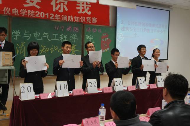 伴随着震撼的消防宣传视频短片,活动正式开始。首先进行班级风采展示,由每位参赛选手分别上台做自我介绍。各位选手英姿飒爽,展现自信风采,并与各自班级共同喊出了响亮的口号,尽显仪电学子的澎湃激情。接下来由主持人宣读比赛规则,比赛分为必答题、抢答题、风险题和附加题四个环节,采用记分排名制。在比赛中,各队选手积极踊跃,发挥出色,尤其在抢答环节,选手们针锋相对,互不示弱。互动环节更是热烈纷呈,同学们纷纷抢答互动问题,回答正确的同学每人获得了一份精美礼物。比赛期间,由每班派出代表上台进行了才艺展示,为选手们加油助威,充分展现了各班同学的才艺和风采,把全场的气氛推向了高潮。经过紧张激烈的角逐较量,最终2012级六班代表队脱颖而出,获得第一名。伴随着热烈掌声,齐占斌老师、房华老师、李允权老师依次为获奖同学颁奖。活动的最后,李允权主任做了总结讲话。他首先代表校保卫处向在本次竞赛中获奖的选手们表示热烈的祝贺,并向积极筹备和组织此次竞赛的仪电学院相关领导老师、工作人员和观众同学们表示诚挚的感谢。他希望学院全体师生进一步加强消防宣传教育工作,增强全民火灾防控和应急处置能力;希望每一位同学都能做到积极主动地学习消防知识,掌握基本的消防技能;希望学院加强领导,广泛动员,加强宣传发动,创新工作载体,制定针对性的活动方案,扎实有效地开展好各项活动,把消防安全宣传各项工作落到实处,推动防灾减灾工作的深入开展。