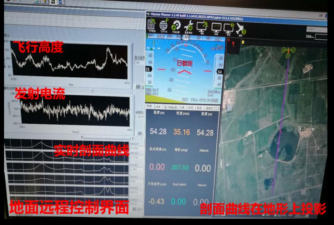 这次成功飞行,标志着我院在直升机航空电磁探测系统中的核心技术方面取得新的重大突破,包括大尺寸软支架吊舱研制、大电流高效发射机研制、大有效面积传感器研制、高精度数据收录系统研制、地面远程监测控制系统研制以及附属的一次场自抵消装置等。系统实现的关键技术指标包括:吊舱直径24米、发射磁矩800000Am2、45节飞行时动态噪声小于±1nT/s、数据采样率192kHz、远程地面控制距离100km。系统整体工作稳定可靠,可实现机上无人操控、长时间、远距离测线飞行,单架次测区覆盖40平方公里以上。