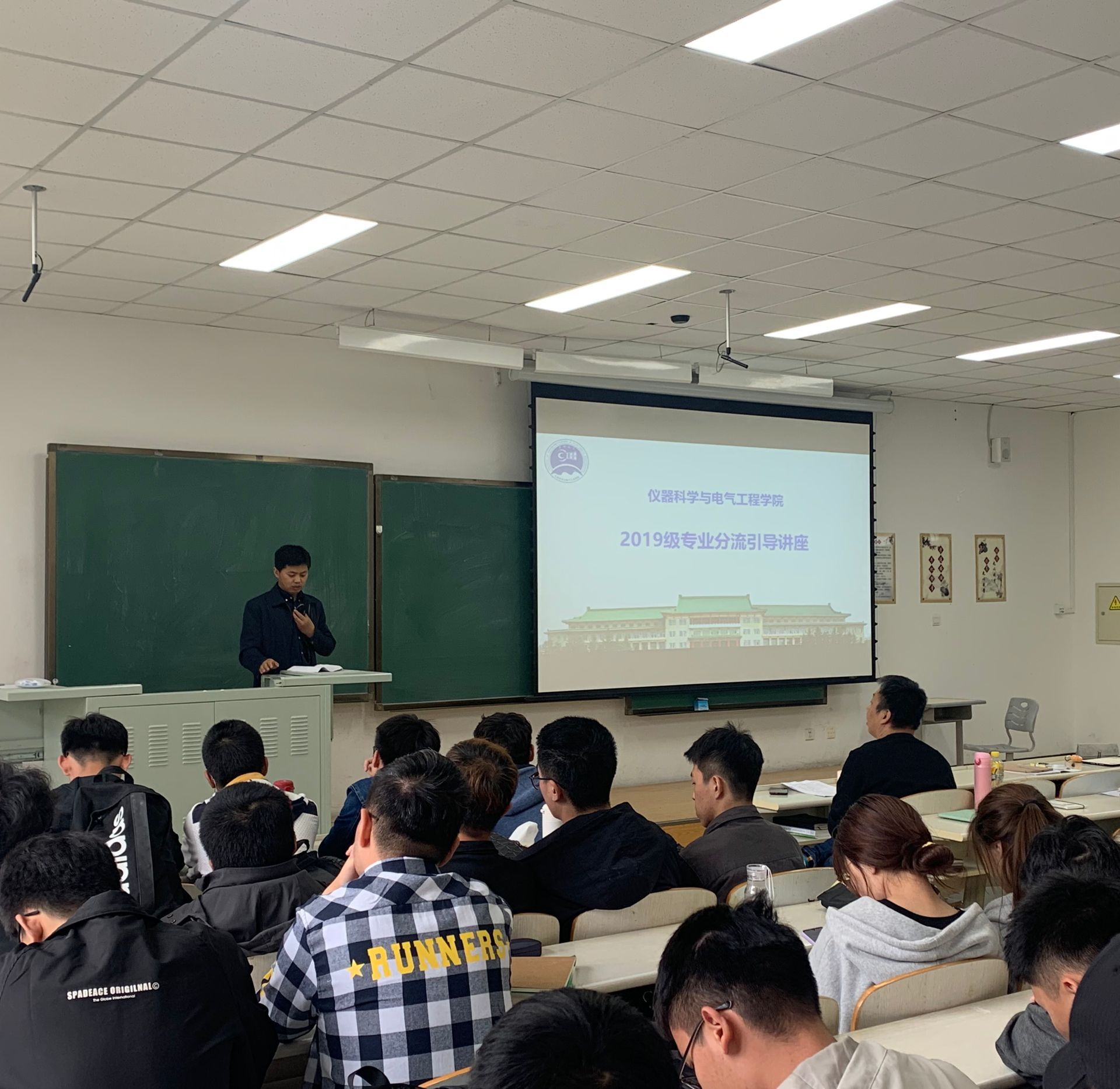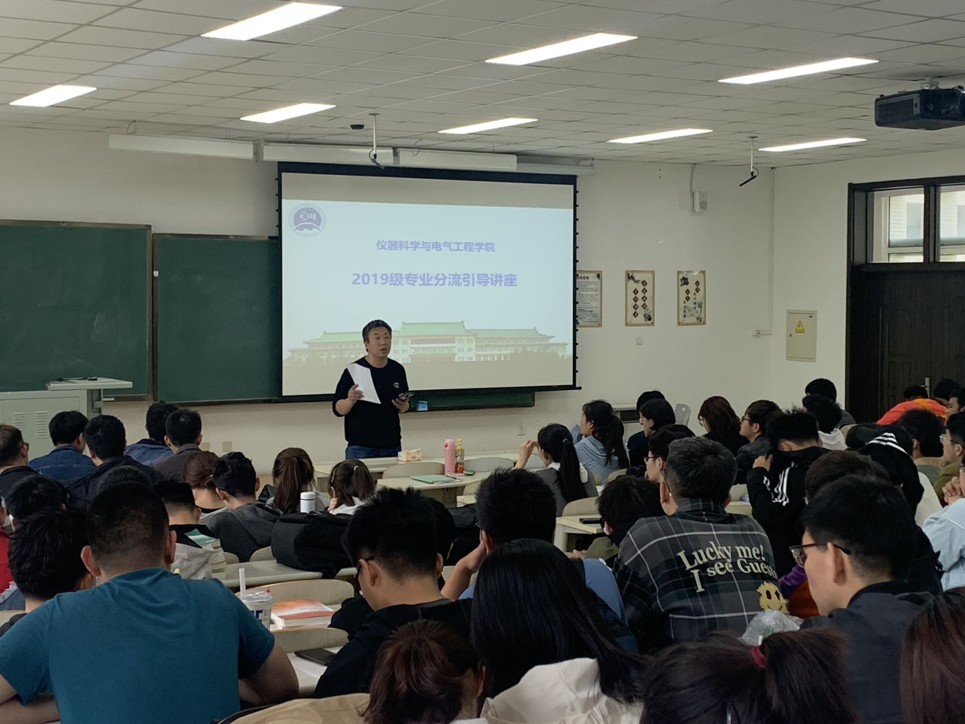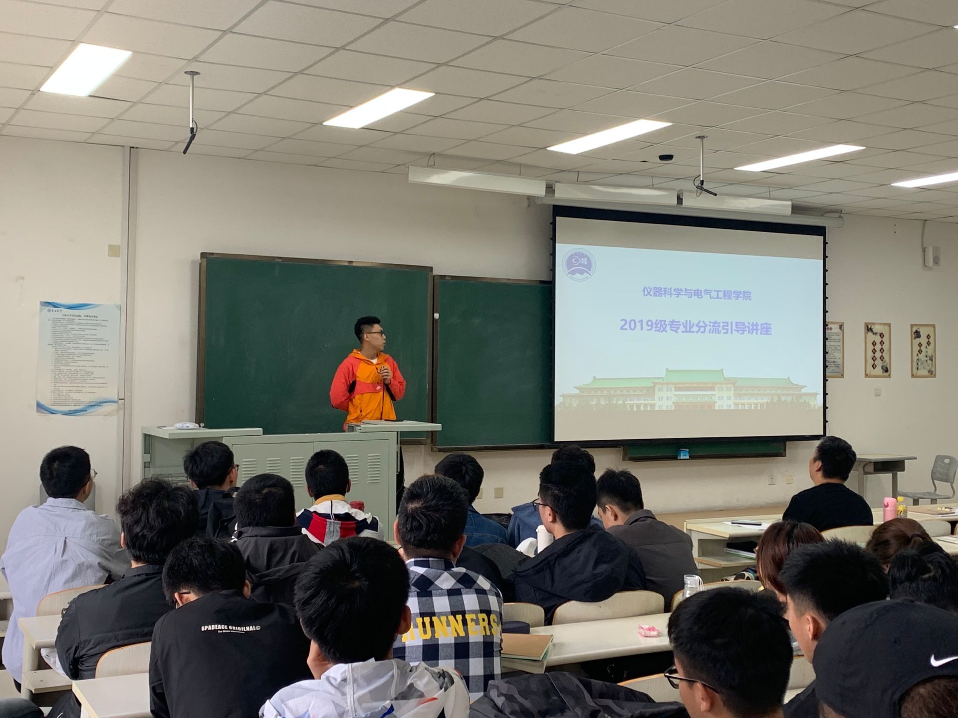 仪器类专业分流实施细则》展开解读,就细则中同学们容易忽略或存疑的问题做了细致提醒和详细说明,并多次强调本次专业分流工作的重要性。关于专业分流工作的具体实施计划,高喆老师向在座同学明确了整体工作安排和重要时间节点,向大家阐明了不同阶段学生要完成的具体任务,以保证专业分流工作顺利完成。讲座还邀请到2018级的两位优秀学生代表为大家分享经验和心得,他们结合个人经历与学习感受,在专业发展方向,未来毕业选择,保研考研形势等方面做了深入浅出的分析,从学生的角度为大家的专业选择提供宝贵建议。最后,周伟书记代表学院向同学们提出了期望,他从新中国成立后科技的发展和科学家两次归国潮谈起,引导大家思考学习的意义,他表示,希望同学们都能够为了服务社会而学习,为了人类社会文明进步而学习。