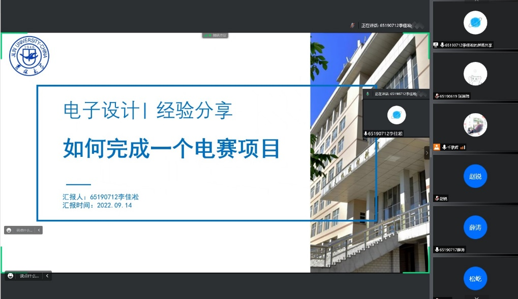 大学生科技创新协会(以下简称“科协”),于2022年9月14日晚,通过腾讯会议直播的方式开办了“电子设计竞赛说明会”。会议由科协指导教师千承辉主持,邀请的嘉宾有参加电赛并取得成绩的程麟涵、汪勇、黄安冉、杨智伟、薛涛、李佳凇和宋诚七位同学。共计161人参会,千老师和各位嘉宾为同学们从不同角度详细地介绍了电赛。
