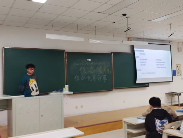 首先,已经保研至清华大学的杨智伟分享了自己的经验。他不仅详细介绍了保研的过程,并强调绩点、科研、英语、竞赛等方面的重要性,也在此过程中介绍了仪电学院测控技术与仪器专业部分保研同学的去向,让同学们对保研现状有所了解。除此之外,他表示,在大学阶段,与高中生活最大的不同是要找到自己感兴趣的方向并坚持下去,应该以知识本身为主而不是仅仅在于考试。最后,他总结到:‘保研’是一场勇者的博弈。