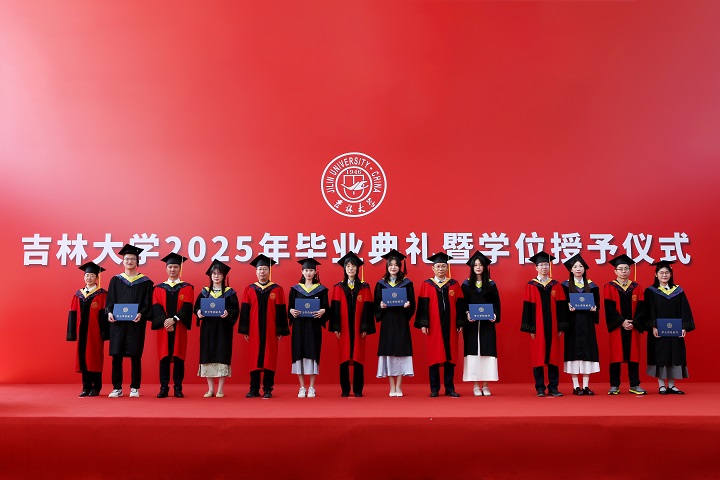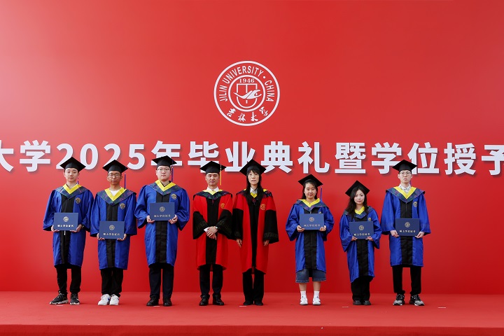 毕业典礼前,学院领导班子全体成员、教师代表与学院2025届毕业生在地质宫正门广场合影留念。