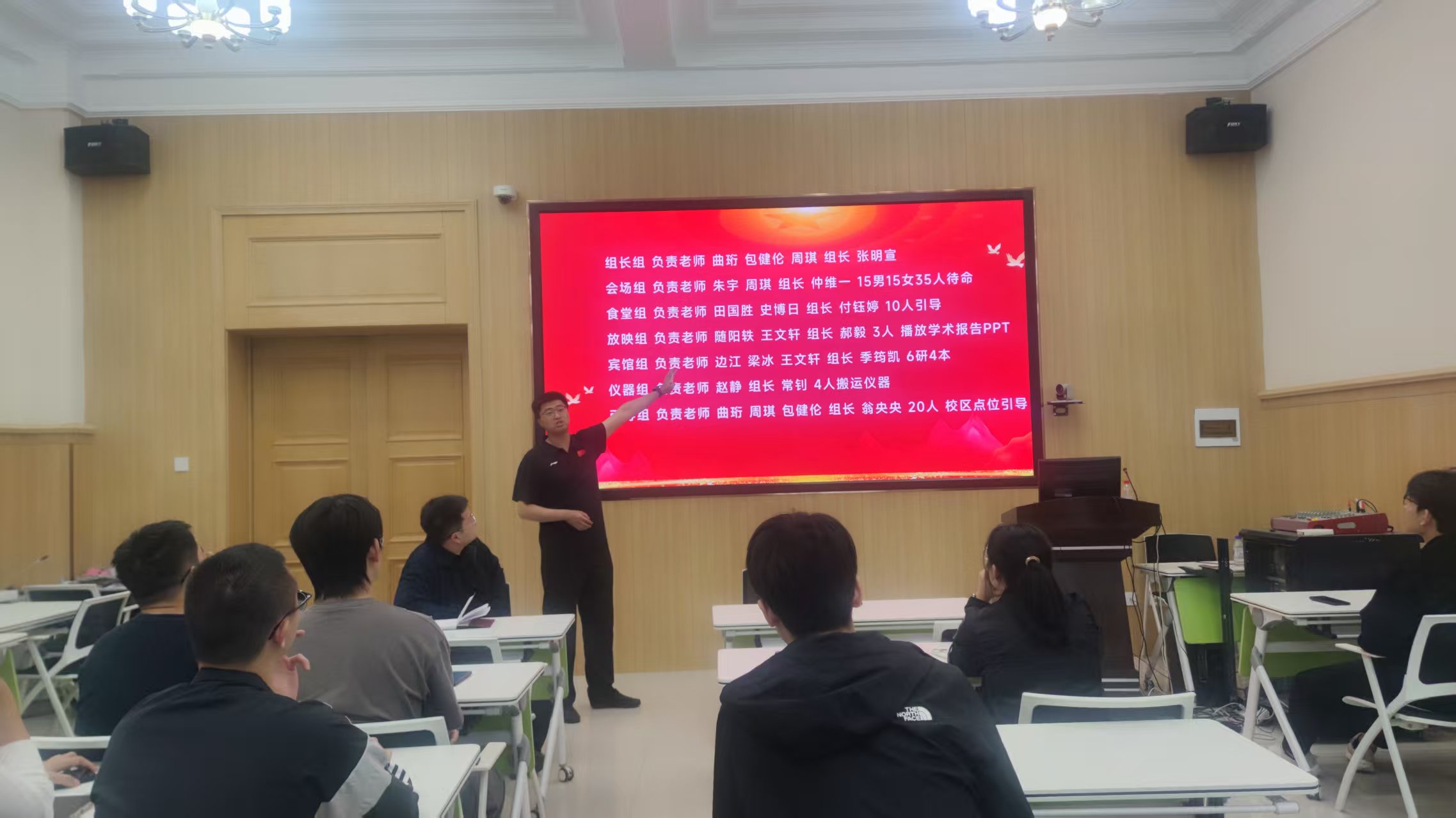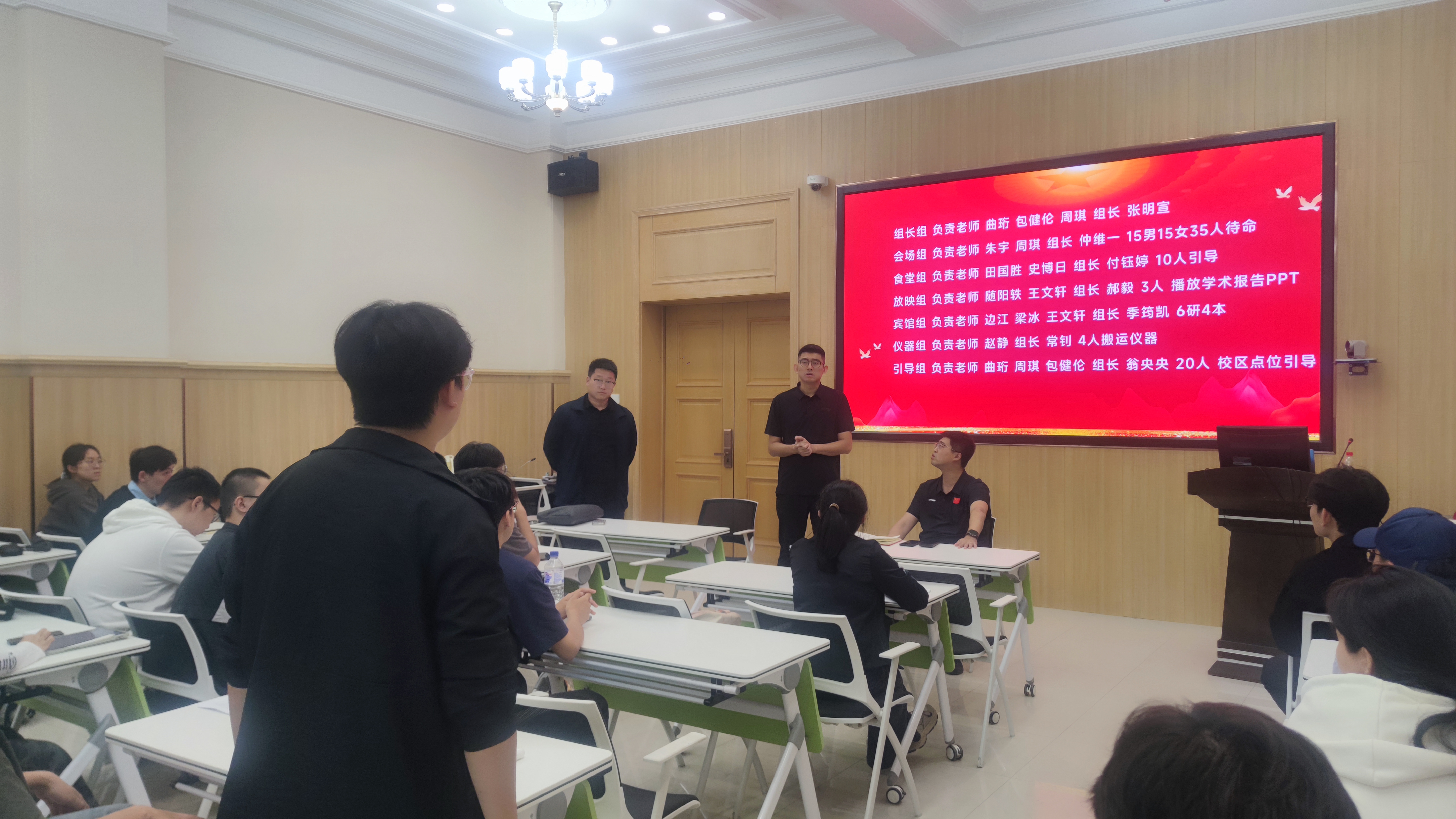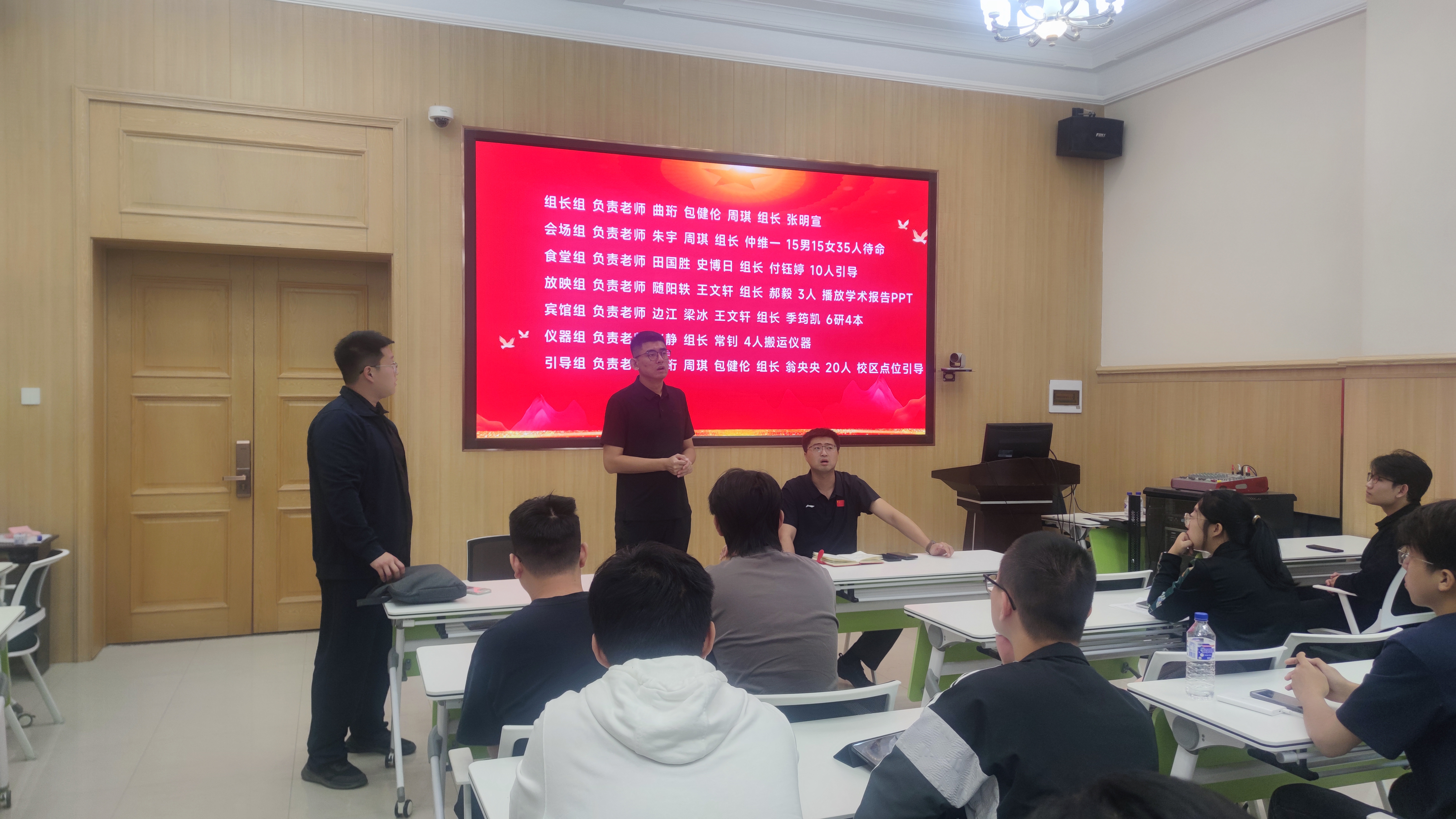 史博日老师和王文轩老师就会场具体工作内容及人员分配进行补充,团委学生会负责人及各年级主要班干部就分组情况进行讨论,确定了各组人员名单并明确了工作内容。