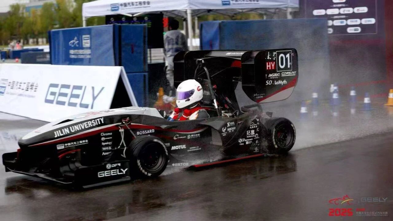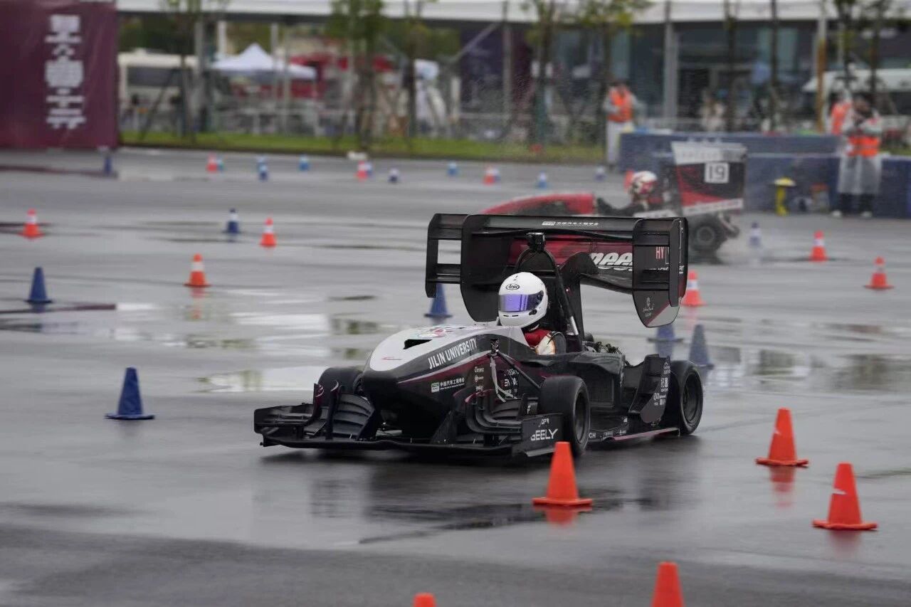 2025年10月8日,再次奔赴郑州参加2025“吉利杯”中国大学生方程式汽车大赛。针对雨战凭借扎实的专业能力,现场对赛车混合动力系统、车身稳定控制系统、扭矩分配控制系统进行特调,保证赛车在湿滑赛道的稳定性。作为车队主力车手,在其它强队接连做出强势有效圈速时,吴林阳顶住压力最终取得高速避障全场第二的好成绩。在耐久赛中,凭借精湛驾驶技术,将圈速刷新到1.06.625,做出了雨地最快单圈。