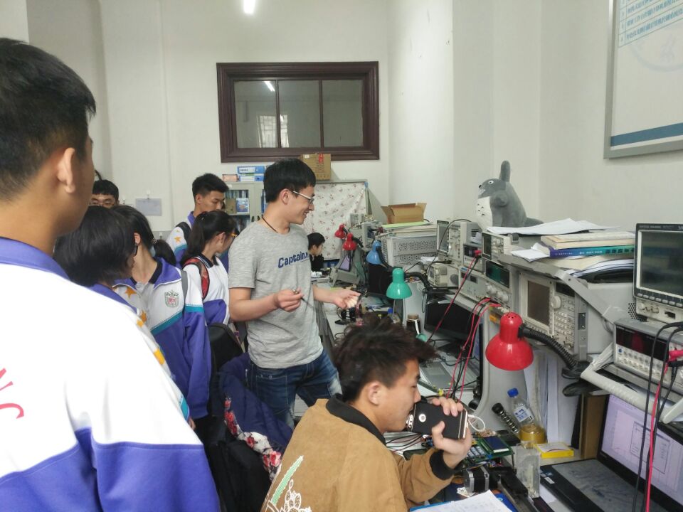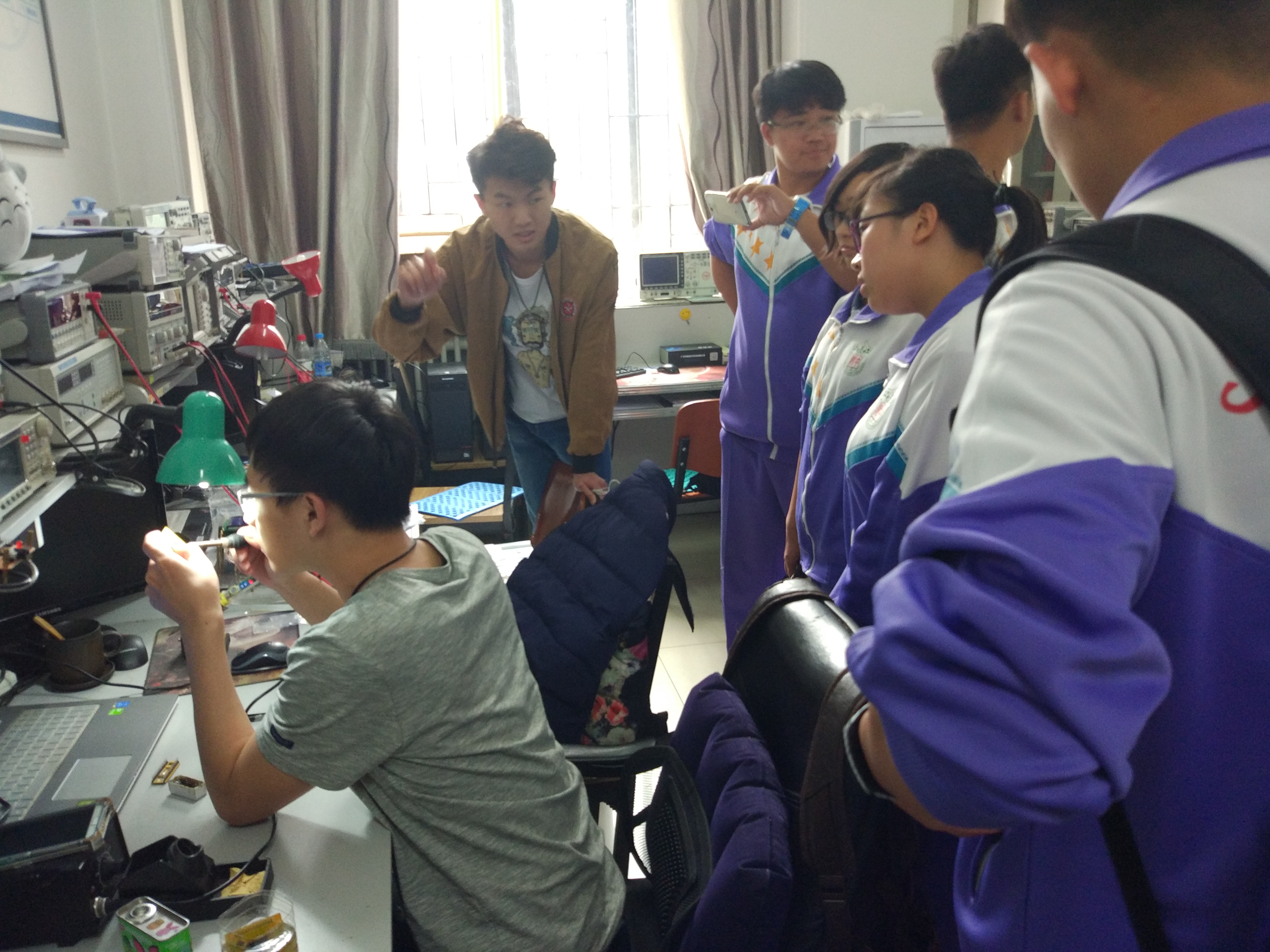 东北师大附中一行来到仪电学院216+实验室,首先科协会长李冰洋为老师、家长以及各位学生代表就216+实验室的整体情况作了详细介绍,然后千老师和张老师便与学生家长进行了深入交谈,学生代表则由科协部长带领分别参观了模电组、电源组以及控制组。参观过程中模电组的同学就实验室的各种仪器设备做了简要的说明,同时以示波器、信号发生器为例作了具体的演示,让同学们了解了仪器的功能及作用;电源组的同学就校赛作品《LED不间断电源控制器》为同学们讲解了电源的工作原理以及重要性;控制组的同学以3D打印机为参观一行人作了详细的演示与讲解,让同学们对控制有了一个大概的认识。随后,大家继续参观了仪电学院优秀作品展览室,展览室中的全国大学生电子设计大赛、吉林省大学生电子设计大赛、大学生创新创业训练等项目中的众多优秀作品不仅吸引了同学们的目光,也引发了他们对于科技创新的极大兴趣。