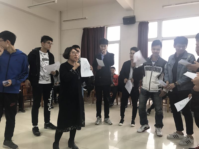 “音乐圈”活动结束之后,白老师给每位同学分发了一张白纸,要求大家画出和自己相像的动物,画出了相同动物的人分做一组,互相说出对方不适合这个小动物的理由。通过这样一个简单的游戏帮助大家认识自己,同时也更好地了解他人。之后,王老师在大家中间摆放了一个象征学年的凳子,让大家跟随自己的想法走到自己愿意离这把凳子的距离。起初大家还不太敢走,在老师的鼓励下,大家依次走到了自己心中认为合适的距离。这个游戏使同学们懂得要为自己的大学生活定一个小目标并努力接近它,这样学习才有动力,生活才有方向!最后,本次心理活动在大家手拿写有祝福语的彩色卡纸的镜头中落下了帷幕。