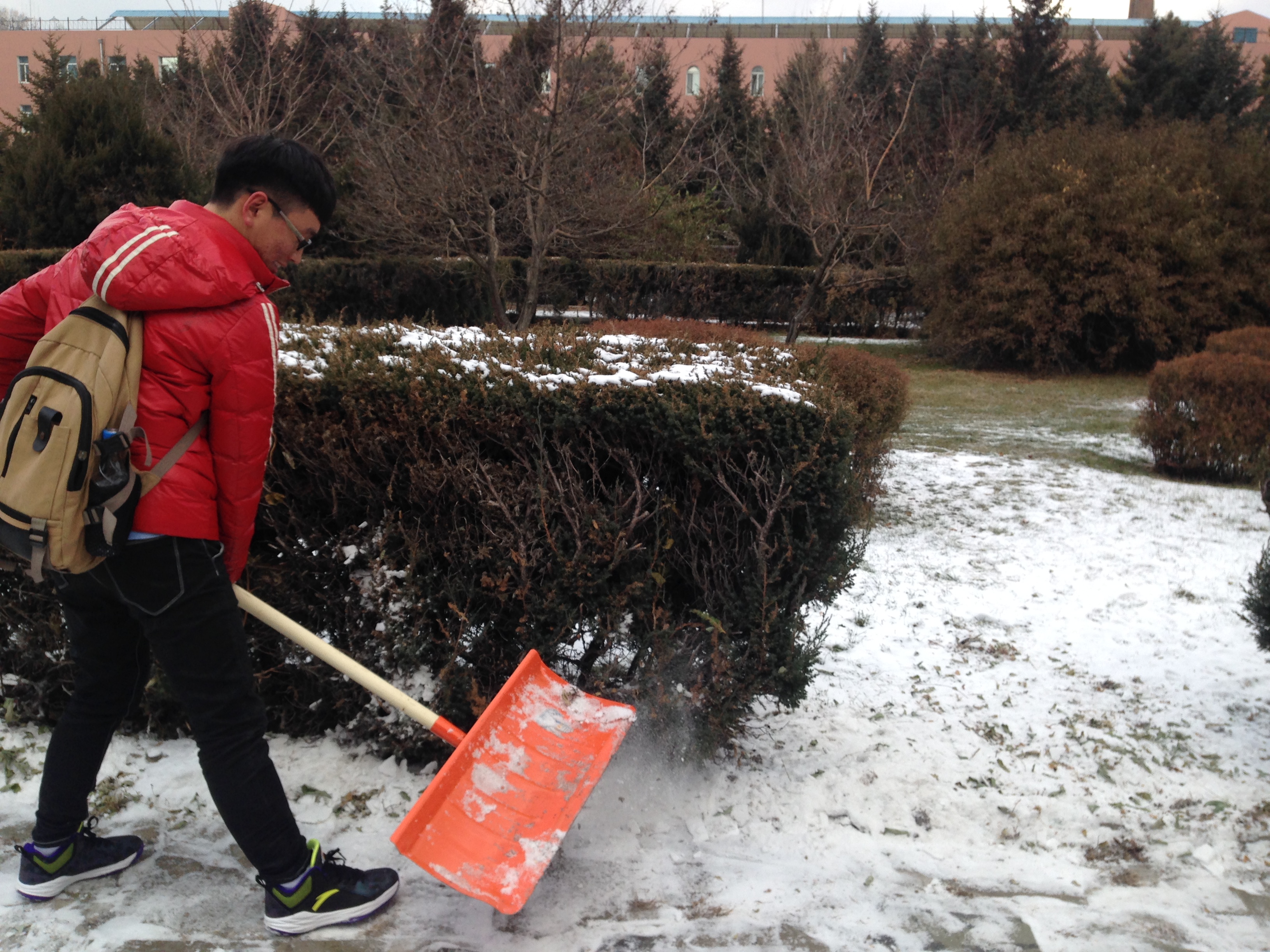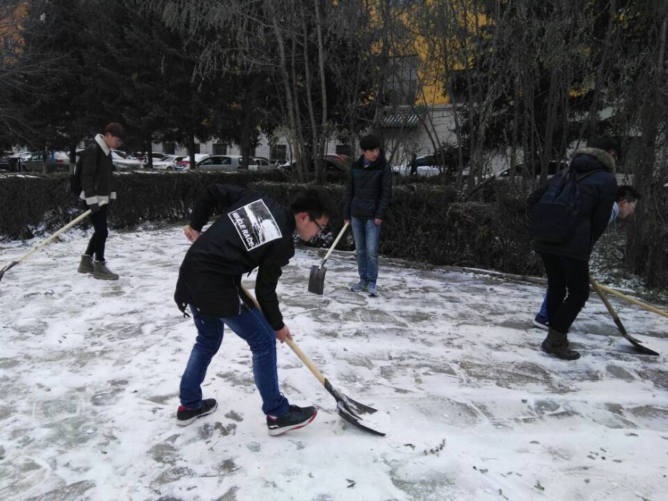 分团委学生会成员迅速出动,亲身拿起劳动工具,以团结合作的精神奔赴各自负责清扫的区域。不惧严寒和劳累,圆满完成了任务。当日气温低达零下十度,呼气成霜,但大家的工作热情始终高涨,把扫雪铲冰当做关系师生安全出行的大事,扫清了关键地段的积雪,为师生的活动和出行安全提供了有力的保障。清雪活动结束后,路过的老师同学们纷纷对大学生志愿者们的辛勤劳动给予了高度评价。