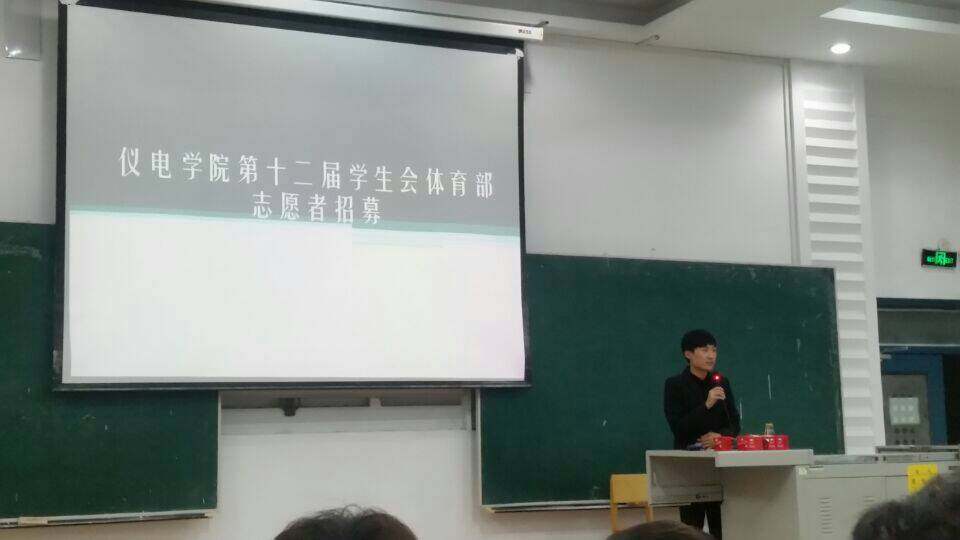 26日晚5点,体育部见面会在经信教学楼F9阶梯教室举行。首先,部长孟金对各位副部长的加入表示了欢迎,其次,部长与各位副部长依次进行了自我介绍增进了彼此的了解,最后,部长对体育部近期的工作任务进行了简单的总结与指导,5点40分,见面会议圆满结束。晚6点,我院志愿者招募大会如期召开,大会上,部长进行了精彩的志愿者招募宣讲,大会结束后,体育部开始进行志愿者面试,最终从诸多面试者中选出了十位较为优秀的学生作为志愿者。