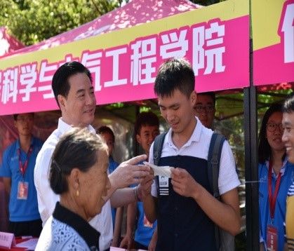 迎新工作点,正逢一新生和家人来到迎新地点报道,李元元校长与年迈奶奶进行亲切交谈,李元元校长向奶奶介绍了色情短剧