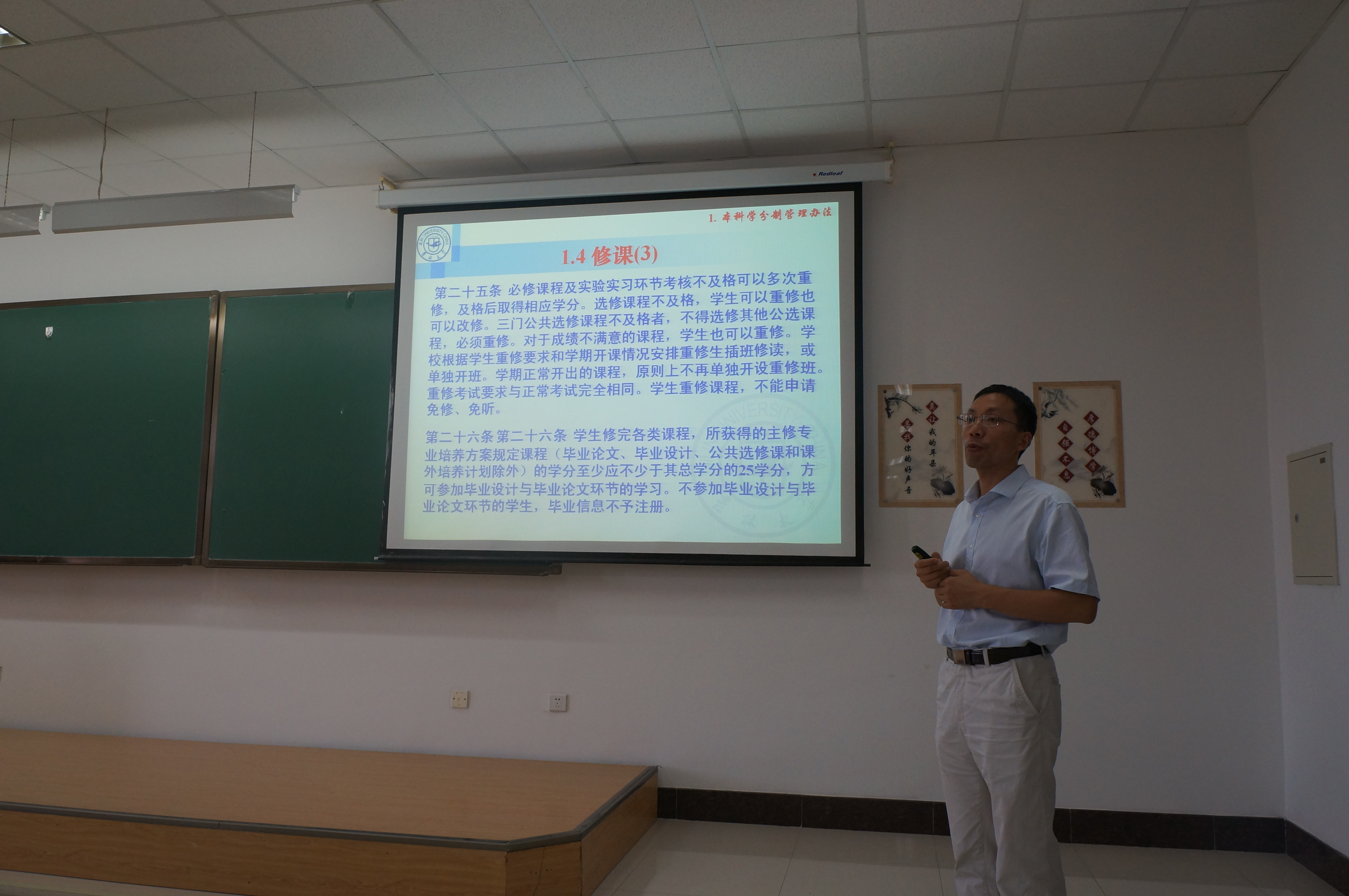 邱增凯老师首先向2016级的新同学介绍了参会的学院领导老师。然后由林君院长发言,院长向全体新生讲解了学院的总体情况,根据学院的历史发展、学科建设、师资力量、科研成果、人才培养,优秀校友,发展方向等几个方面向新生们进行了简要的介绍,同时,他还借助哈佛大学研究的结果鼓励新生要有明确的目标,他还鼓励培养新生们海纳百川,胸怀天下的激情,希望16级新生可以在未来的发展中为祖国献上自己的力量。在新生对自己的学院和所学专业有了初步了解之后,副院长陈祖斌教授为新生讲解学院的教学工作。他根据学校的规章制度,在学分制度、学籍变动、校际国际交流、保研直博政策,学业预警工作等方面向新生们做了详细的介绍,让全体新生感受到色情短剧