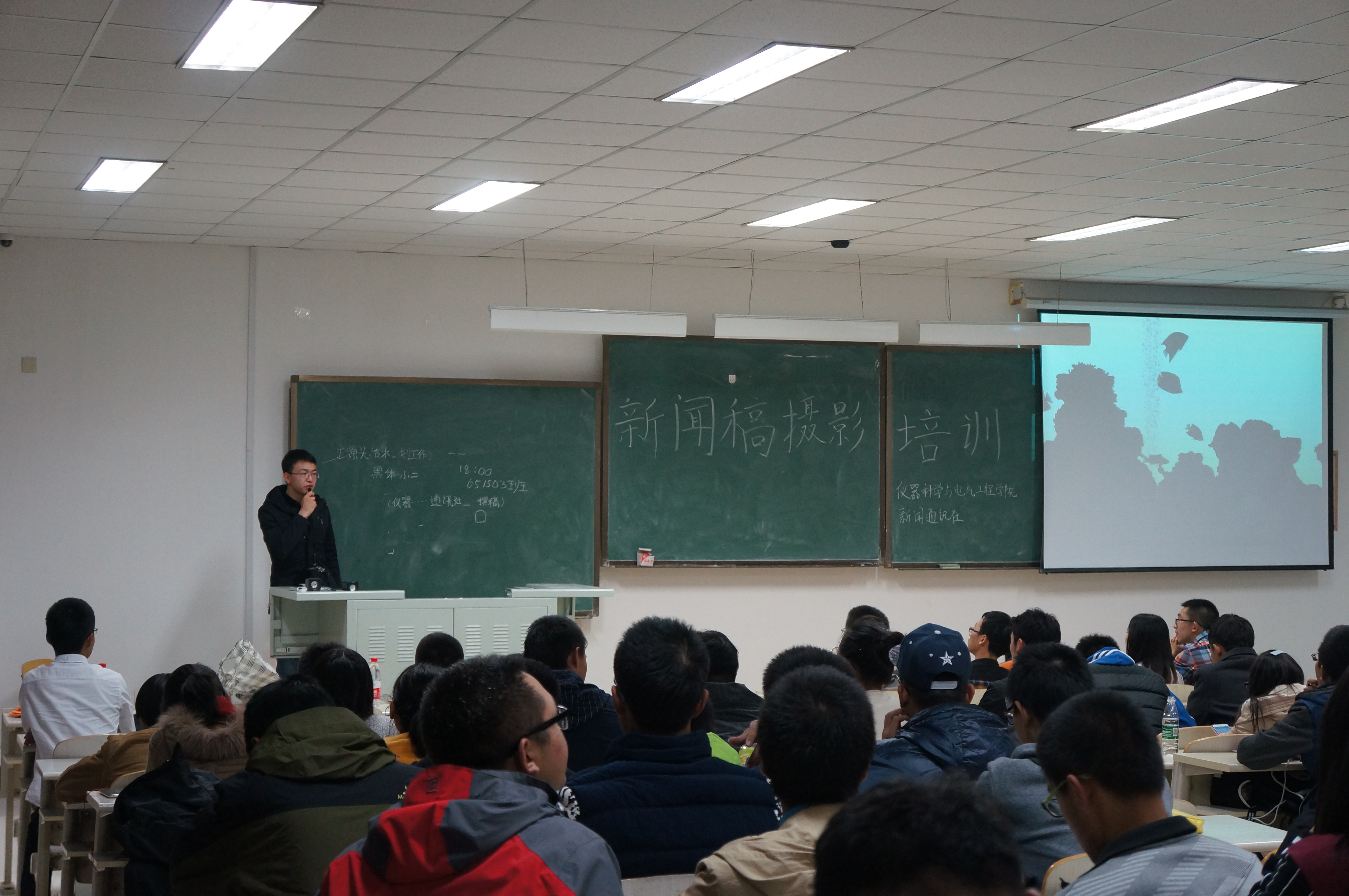 分团委新闻通讯社于2015年11月1日19:00在李四光楼208室举办了摄影培训活动。新闻通讯社社长任晓闯,副社长仇铭婕、陈乾,学习部部长赵成出席了此次培训活动,学生会各相关部门的部员参加了此次培训。