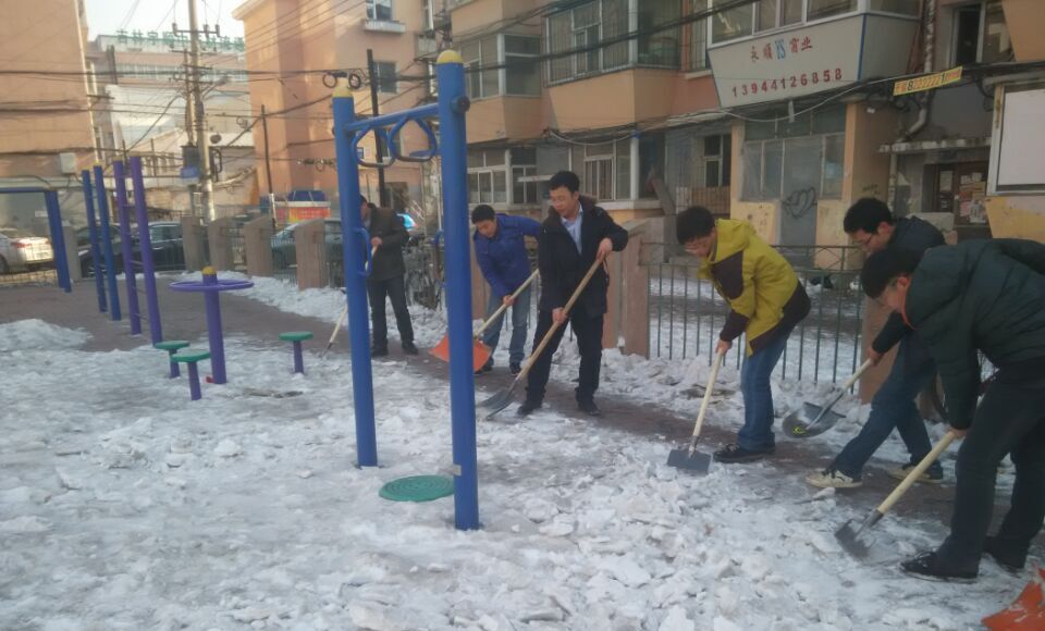 团委迅速组织志愿者进入社区进行除冰除雪活动。社区工作人员对大学生志愿者们的到来表示热烈欢迎,并代表社区全体居民对大家表示感谢。随后,大学生志愿者们迅速投入到了“紧张而忙碌”的除雪除冰大战中。全体志愿者们分工明确、团结协作,发扬雷锋精神,不怕苦、不怕累,主要对社区广场进行了清扫,但是由于积雪长时间未除积攒较厚,加上天气变暖造成的部分积雪融化又结冰,使得此次积雪清理并不是非常顺利,志愿者们只能先用铁锹一点一点的把冰块敲碎,然后才能整个清除掉。大家认真细致地完成每个环节。虽然天气寒冷,许多同学的脸和手都冻红冻僵了,但是大家热情似火、干劲十足,社区很快就被大家清扫干净,面貌焕然一新,志愿者们的脸上也露出了开心和满足的笑容。大扫除活动结束后,社区工作人员和居民们纷纷对大学生志愿者们的辛勤劳动给予了高度评价。