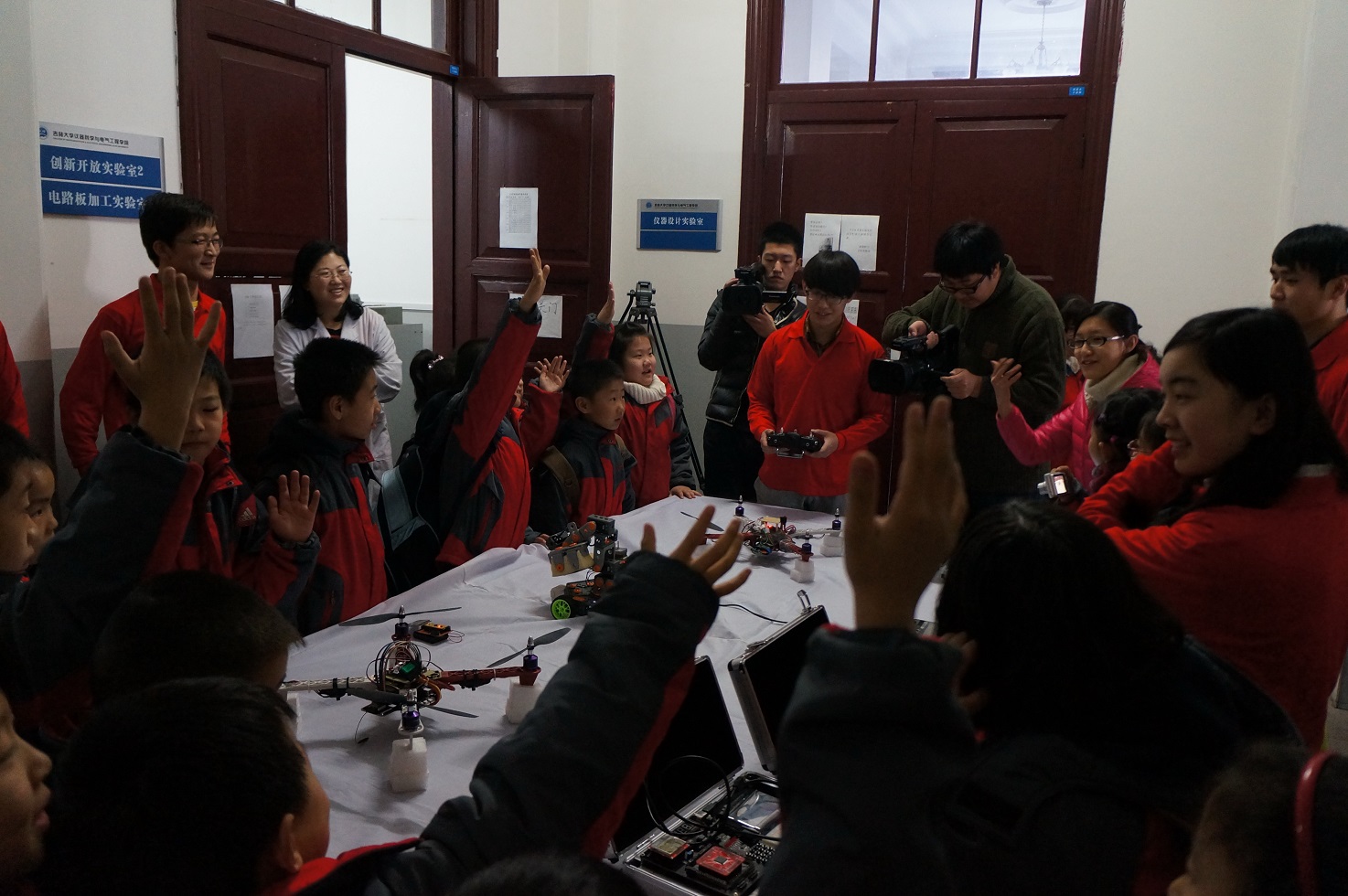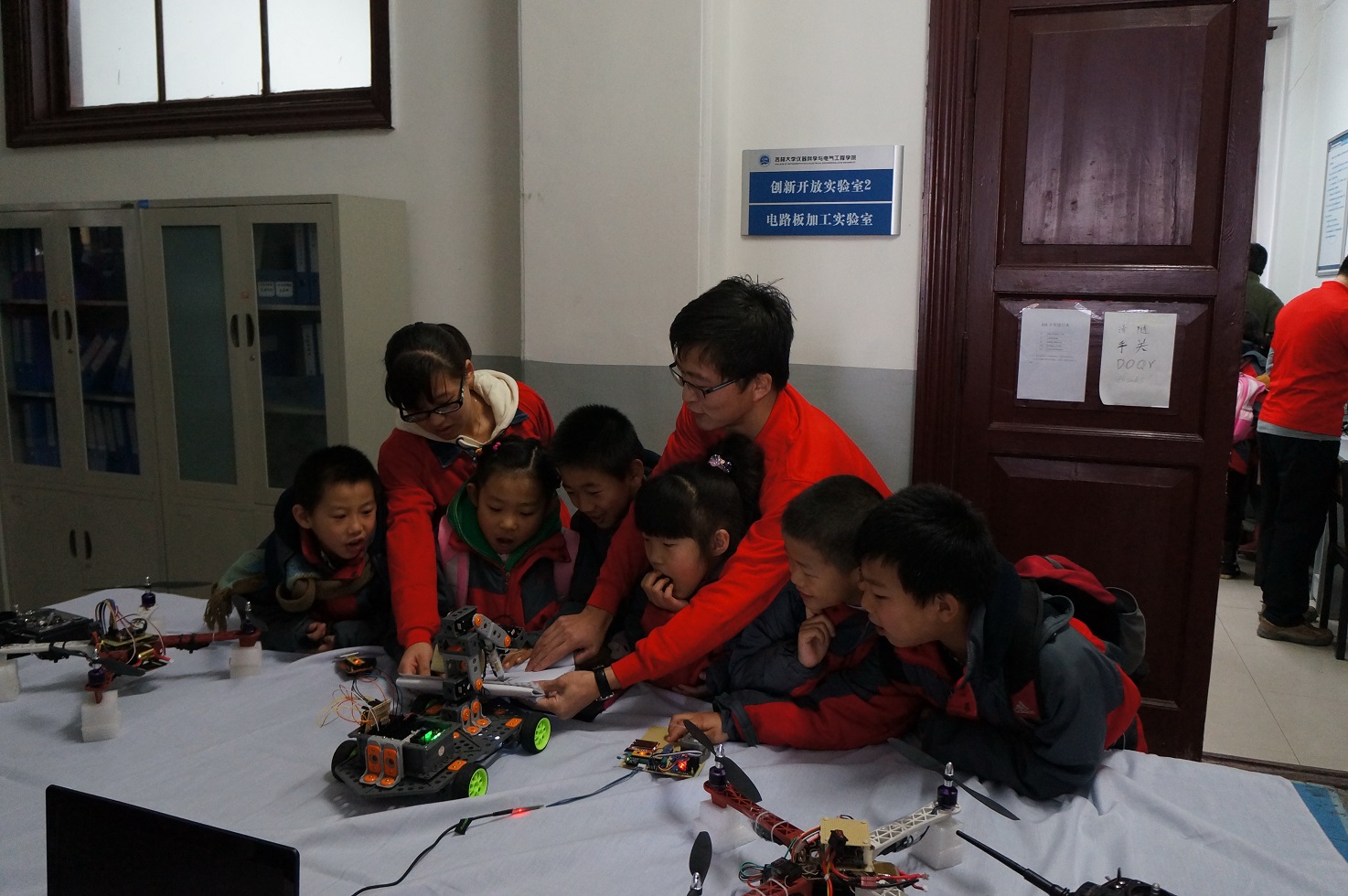朝阳校区地质宫门前,我院大学生党员志愿者在院团委书记兼本科生党支部书记朱宇、本科生党支部副书记张昊宇及学院主要学生干部的带领下热情地接待了他们,并对孩子们的到来表示热烈欢迎。随后科技参观活动正式开始,孩子们在我院大学生党员志愿者的带领下,首先参观了我院历年大学生电子设计竞赛的优秀作品,奇妙的电子作品让孩子们大开眼界。随后,孩子们在志愿者们的指导和带领下尝试了一些简单的电子模块制作,在动手实践中体会到了科学知识带来的无限乐趣。最后,孩子们又来到了我院大学生科技创新开放实验室,实验中心千承辉老师和万云霞老师在这里热情地接待了他们,带领他们参观了各式各样的实验仪器,并亲自为大家进行演示,小朋友们认真聆听、跃跃欲试,从孩子们清澈明亮的眼睛里我们看到了他们对科学知识的渴求和对大学生活的向往。