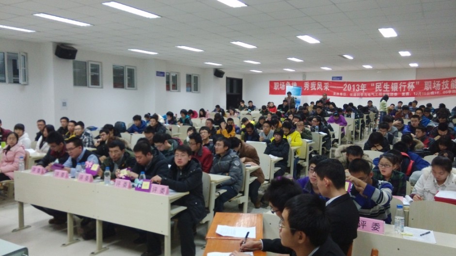 团委、学生会携手民生银行长春支行营业部联合开展了2013年“民生银行杯”职场竞技大赛。经过前期初赛和复赛的激烈角逐,本次大赛的决赛于2013年12月18日晚在中心校区李四光楼304室举行。本次决赛特别邀请了仪电学院学生工作办公室主任王冕老师、校学生工作部姜宇航老师、公共卫生学院团委书记苏国范老师、植物科学学院姜晓春老师、仪电学院团委书记朱宇老师和民生银行长春支行营业部负责人作为评委出席活动,学院分团委、学生会主要学生干部以及2013级全体同学共同参加了此次活动。
