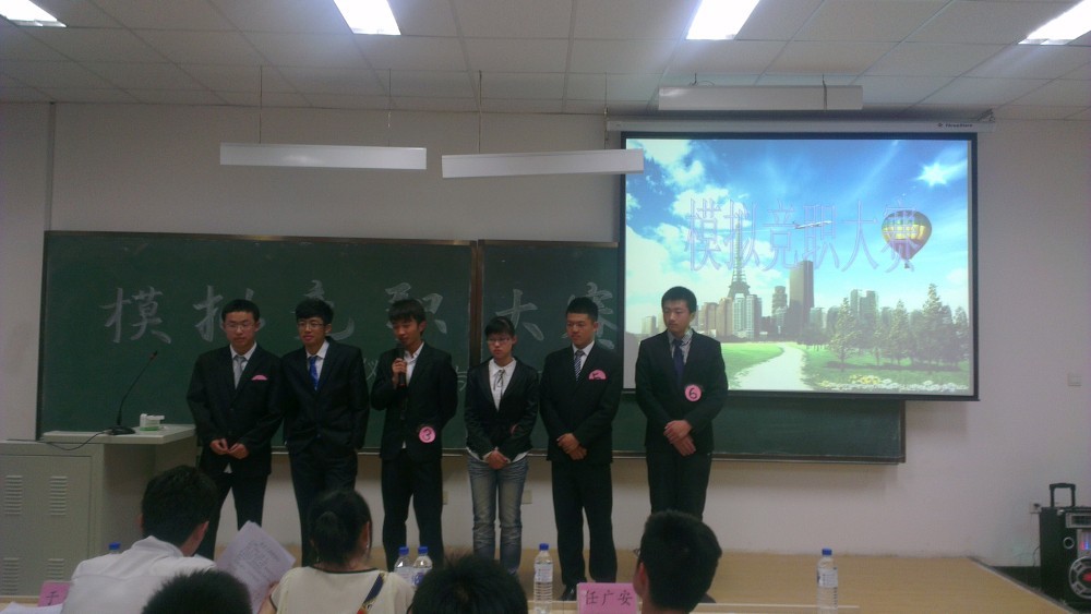 团委、学生会于2013年5月31日18:30在中心校区李四光楼109教室举办了2013年度模拟竞职挑战赛,学院第八届学生会主席团全体成员和2009级应届优秀毕业生代表宋晓敏、李悦智、于光辉出席了本次活动,2012级全体同学参加了此次活动。