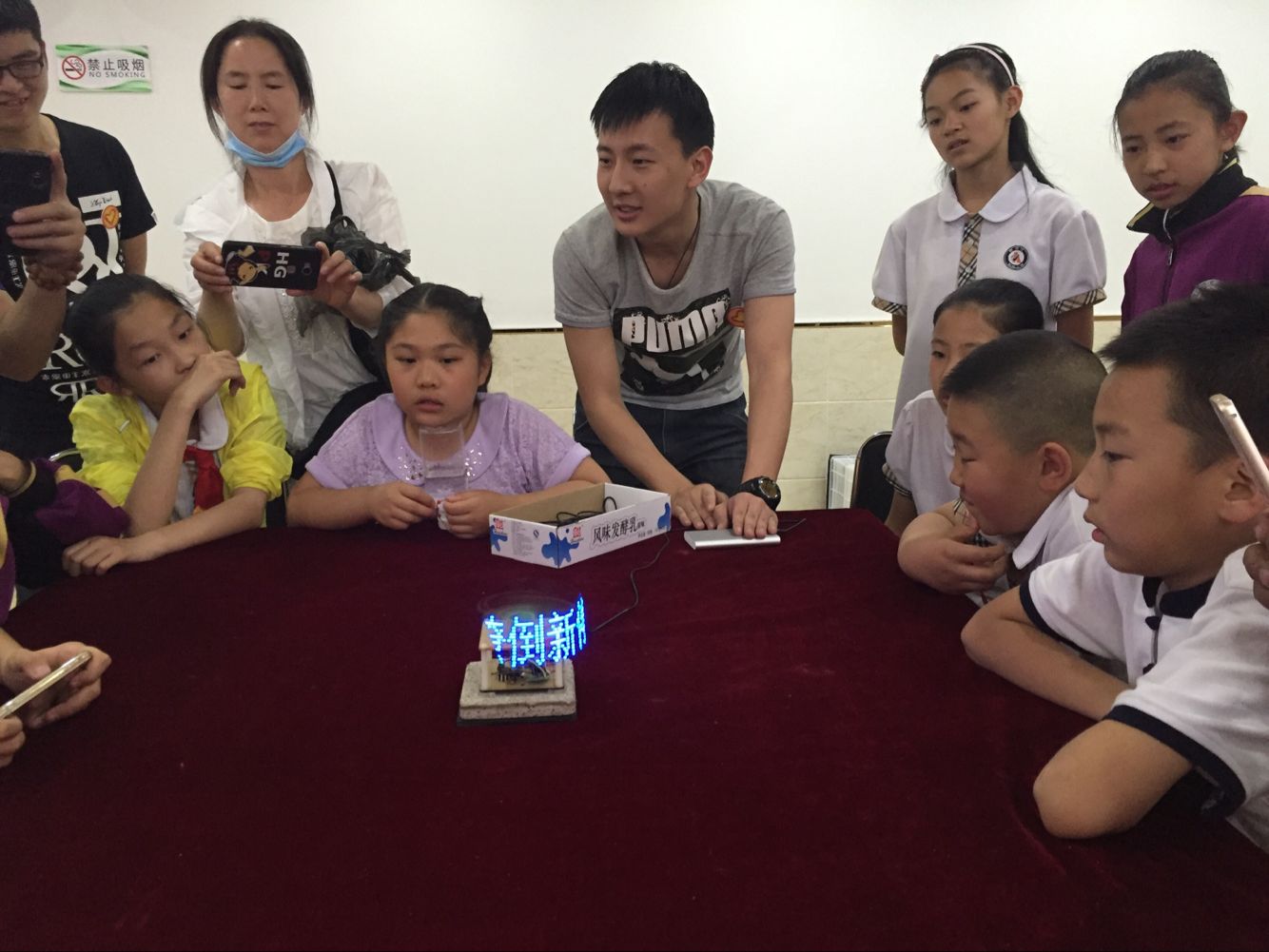 4月24日至5月24日,在活动的校园准备期间,负责人袁锦烽悉心督促22组志愿者自主完成电子产品的设计;5月25日晚6点,由大学生科技创新协会会长李冰洋组织进行优秀作品的评分筛选,志愿者们热情高涨的展示介绍自己的电子作品。5月27日,为了喜迎六一儿童节的到来,志愿者们走进西朝阳社区,与孩子们互动,向孩子们讲解科技作品原理。垂直led旋转屏趣味性强,与孩子们产生了良好的互动,大家纷纷写下自己的名字并通过旋转的屏幕展示出来;激光竖琴让有音乐天赋的孩子大显身手,动听悦耳的琴声在空气中洋溢着,小孩子们情不自禁地鼓起了掌,家长也点头称赞;六足避障机器人也让孩子们动起手来,每成功避开一个障碍物,孩子就发出兴奋的笑声,热闹非凡。与此同时,负责人也与社区书记和家长们进行了愉快的交流。
