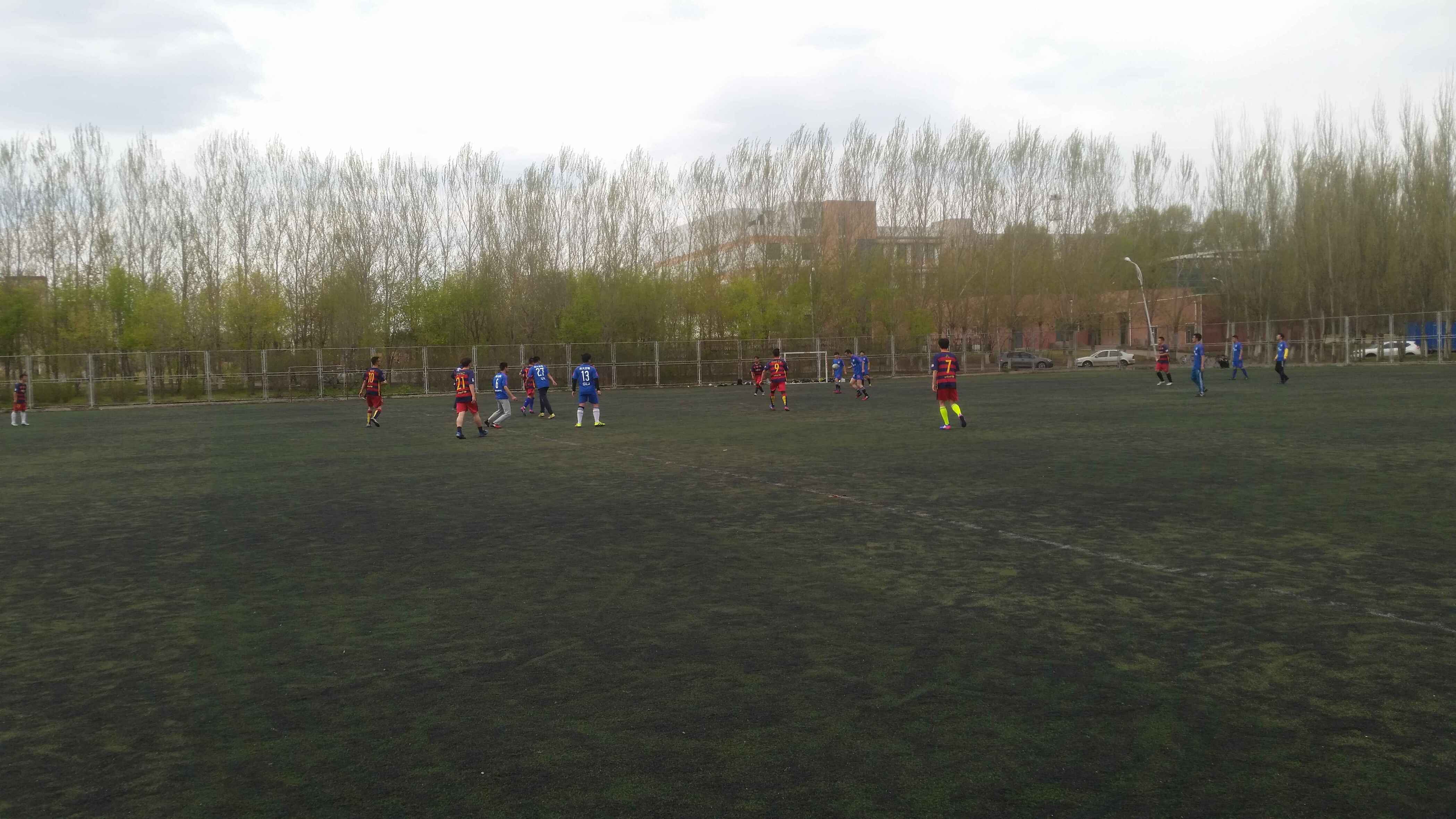 本场比赛,我队三名主力球员回归赛场,我方以最佳阵容出战。上半场比赛开始时,我方队员进攻欲望强烈,连续给对方后防线施加压力。比赛进行到第10分钟时,我院队员在禁区内手球,被判罚对方点球。但我院门将成功扑出对方势大力沉的点球,在此之后,我院队员士气大增,不断攻击对方后防线。比赛进行到第15分钟时,我院赢得前场任意球机会,并由8号张家琦直接任意球破门,我院1:0领先。此后,双方都加强了防守,比赛陷入僵持阶段。上半场结束前一分钟,对方依靠点球破门扳平比分。上半场双方以1:1战平。
