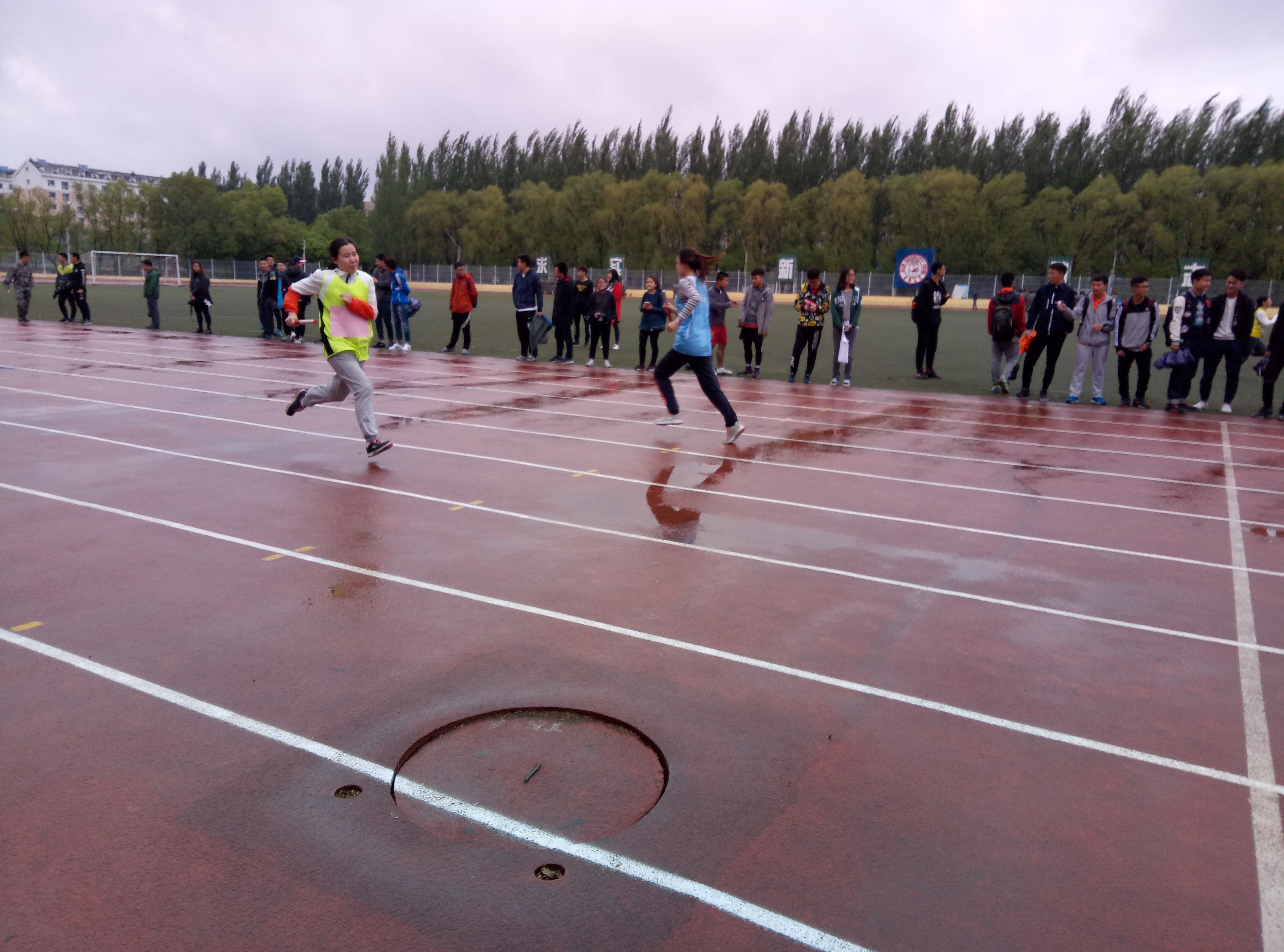 随着一声枪响,比赛正式开始。我院男子组的运动员率先登场,在风雨的阻挠下奔跑,在尚有积水的赛场狂奔。此时,风,渐歇、雨,渐停。我院运动员在湿滑的塑胶跑道上顺利完成比赛,取得了小组第四名的成绩。在男子组完赛之后,女子组的比赛紧随其后,我院运动员们在第三组登场,姑娘们在运动场上留下了她们矫健的身姿。似是与男子组相呼应,她们同样取得了小组第四名的成绩。而八乘一百米迎面接力预赛的比赛也就此顺利落下帷幕。此时,阴云散去,似是天公也被健儿们的竞技精神折服。