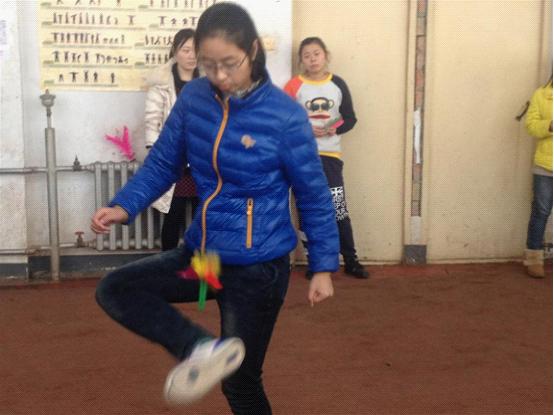 比赛在中心校区体育馆长廊进行,队员们提前入场热身,将身体调整到最佳状态。毽球对抗赛中,队员们用腿和脚来完成各项高难进攻防守动作,“毽球”的网前扣杀和险象环生的防守技术,无不令人称奇。队员们英姿潇洒不断变换着各种各样的花式,让观众们眼花缭乱,大呼精彩。一次次成功的进攻,一次次绝妙的防守,使得与对手的比分不断被拉开。现场的啦啦队也连忙为队员们助威加油,比赛进入了高潮。助威声,队员的呼喊声连成一片,我队控制了比赛的节奏和进度,最后以大比分领先取得了胜利。“平踢毽”项目比赛中,双方斗智斗勇,毽子在空中飞来飞去,你踢我接,扣人心弦。队员们个个奋勇向前,努力拼搏。在落后的情况下互相鼓励,不急躁,不气馁,不互相埋怨,充分发扬了团结协作的精神。同时赛出了激情,踢出了活力,打出了自己最佳的水平。最后,女子团体获得了二等奖。