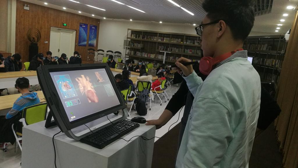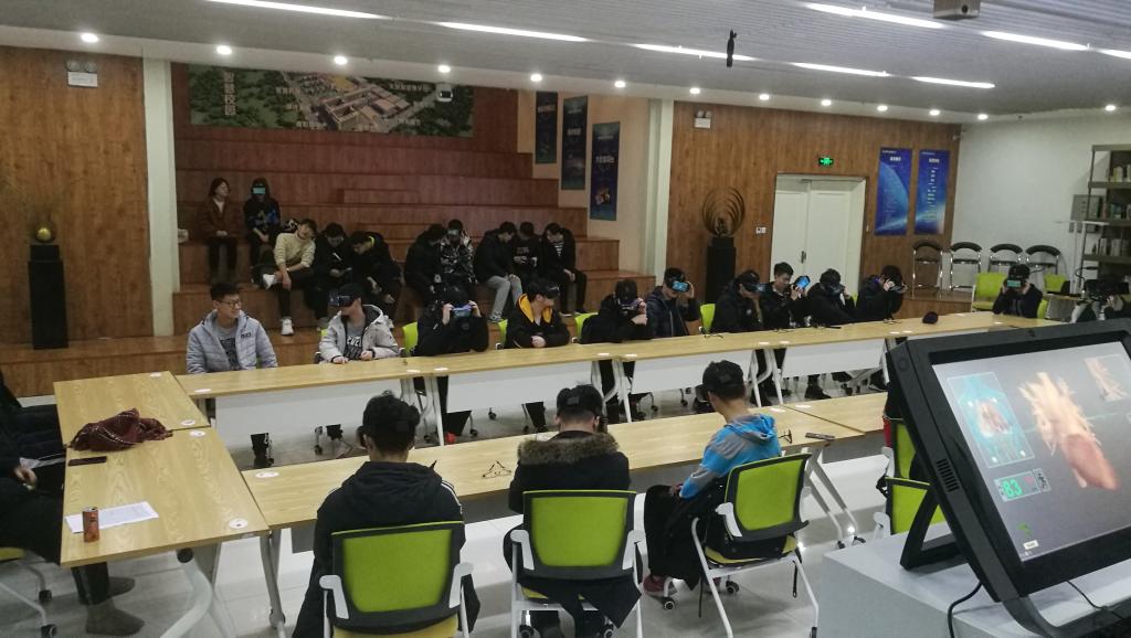 参观活动开始,领队老师将同学们分为4组,前去不同的参观地点。首先是体验VR技术,感受科技对日常教学的辅助功能。现场老师向同学们讲解了VR技术的发展历史以及发展前景,接着让同学们体验了VR技术,同时邀请感兴趣的同学上前体验VR技术在医疗教学上的应用。同学们对此表现十分踊跃。其次是参观色情短剧