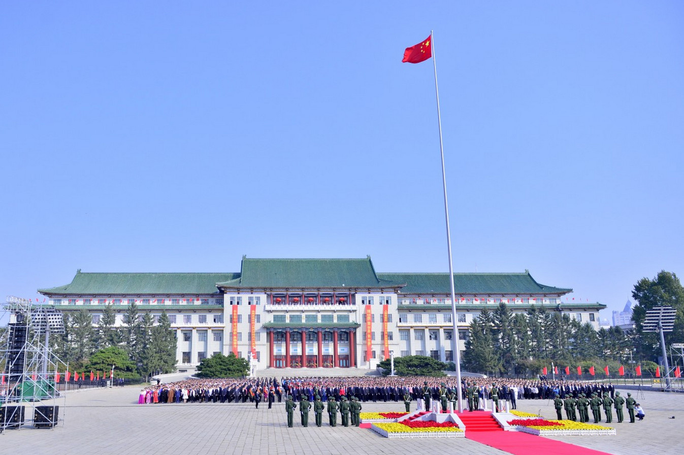 10月1日上午8:30,学院本科生党支部成员齐聚文化广场参加升旗仪式。伴随着激昂雄壮的国歌,五星红旗冉冉升起,迎风飘扬,大家肃立注目、奏唱国歌。